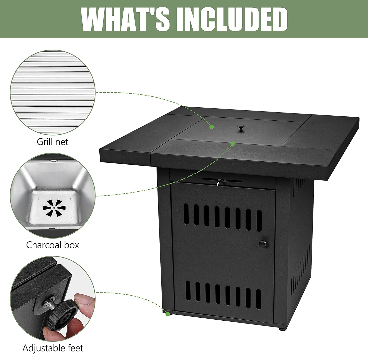 - 3-in-1 tuintafel – de sfeerhaard kan als tuintafel met deksel worden gebruikt. Als je houtskool in de kolenbak legt, wordt hij een warmtebron – als je de grill gebruikt, wordt hij een grilltafel